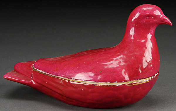 A KUZNETSOV RUSSIAN PORCELAIN COVERED BIRD FORM BUTTER DISH, CIRCA 1890. An Imperial Russian porcelain, Kuznetsov comprising a two piece bird form covered butter dish, underside with red stamp of Kuznetsov beneath the Imperial Warrant, Length 8 inches (20.2 cm).