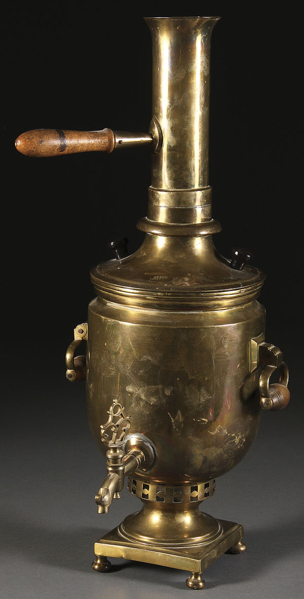A RUSSIAN BRASS SAMOVAR WITH SMOKE STACK, 19TH CENTURY. Stamped with maker's mark, with wood appointments and working spigot, raised on bun feet. Overall height 21 inches (53.3 cm).