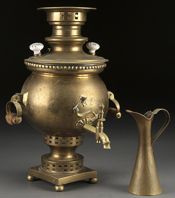 A RUSSIAN BRASS SAMOVAR, 19TH CENTURY, BATASHEV. With porcelain mounts, height 14.5 inches (37 cm). Together with an Arts and Crafts Tuk pitcher, height 6.5 inches (16.5 cm).