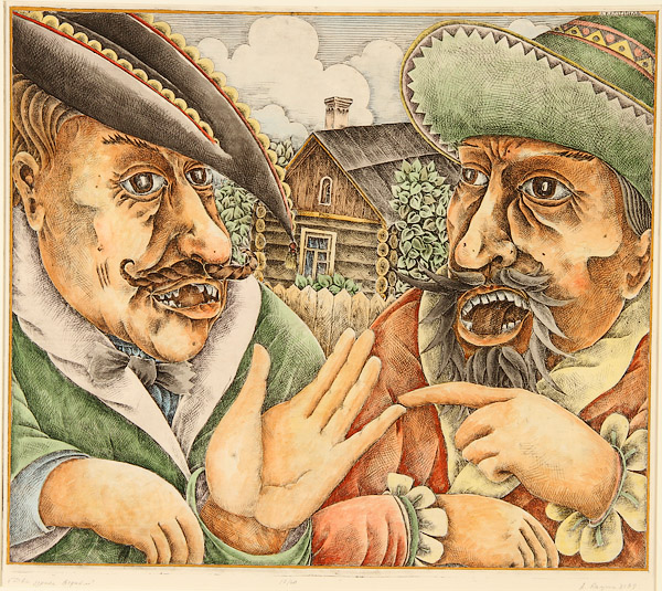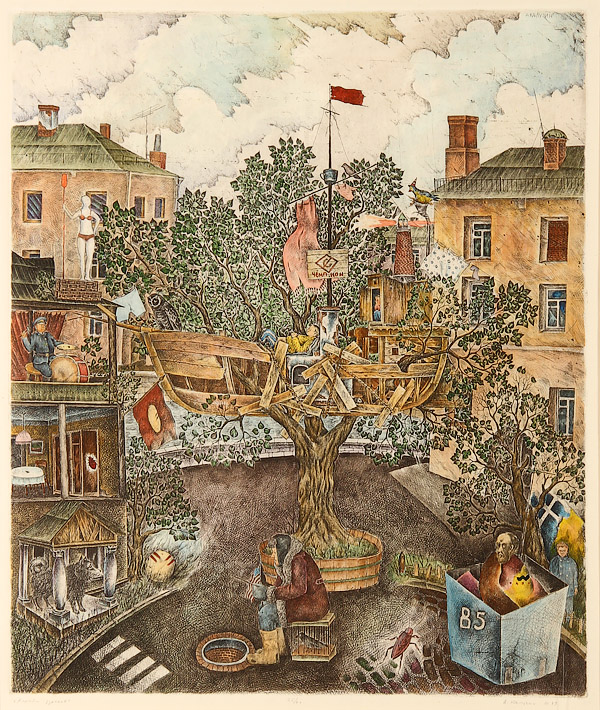 PAIR OF RUSSIAN HAND COLORED ENGRAVINGS, ALEXANDER KALUGIN (RUSSIAN 1949- ), CIRCA 1989. Both artist signed and with Russian idiomatic titles "The Threesome of Two Fools" and "A Ship of Fools", 17 inches x 19.75 inches (43.2 x 50.2 cm), the other 27 inches x 23 inches (68.6 x 58.4 cm).