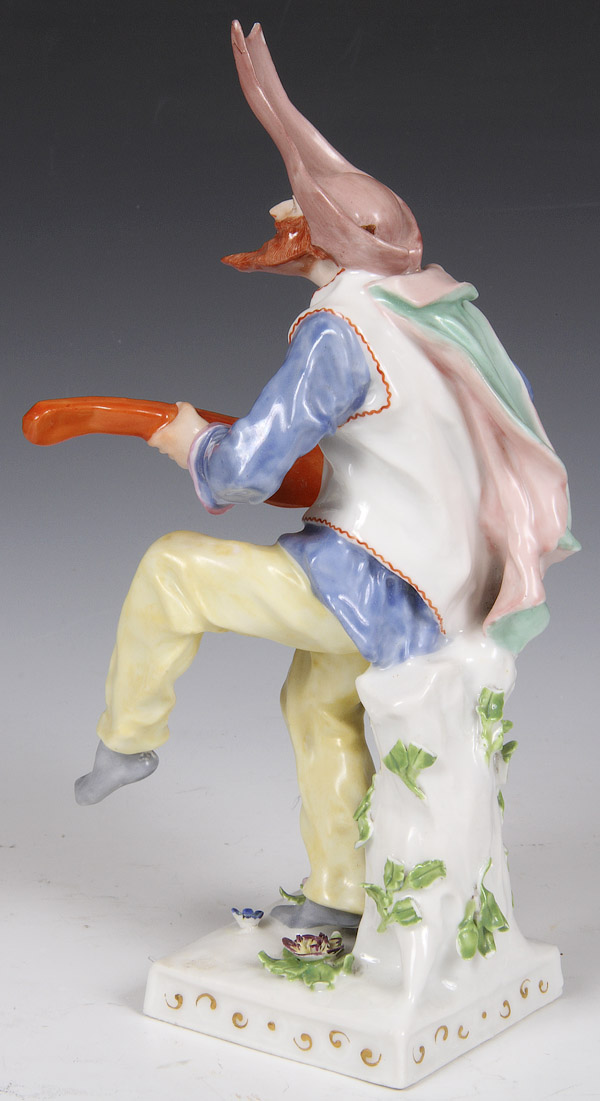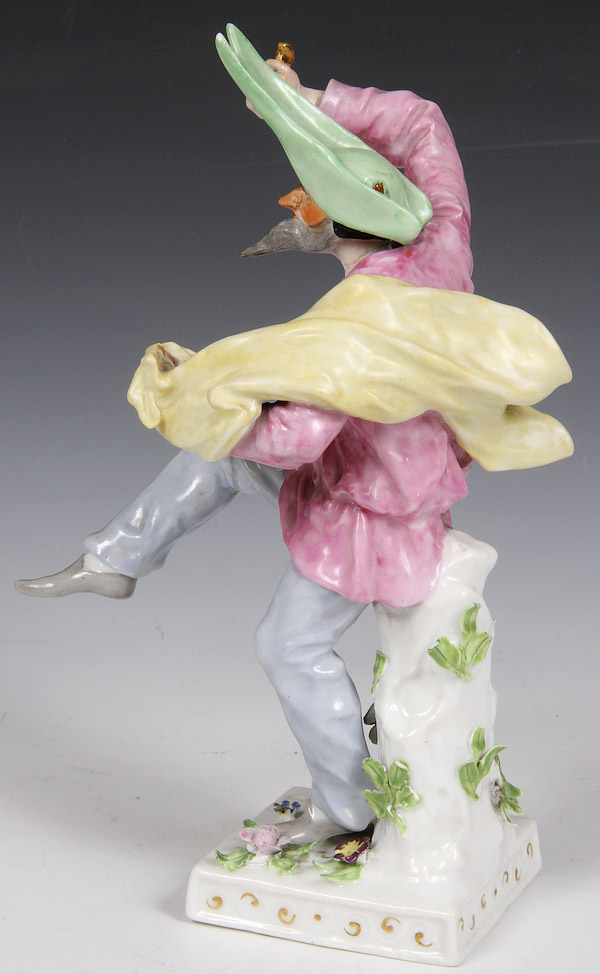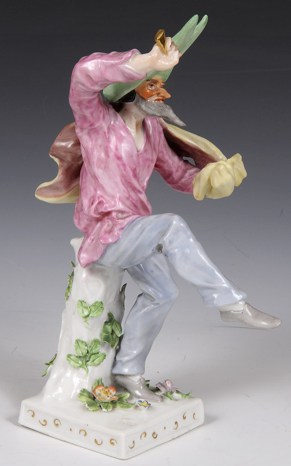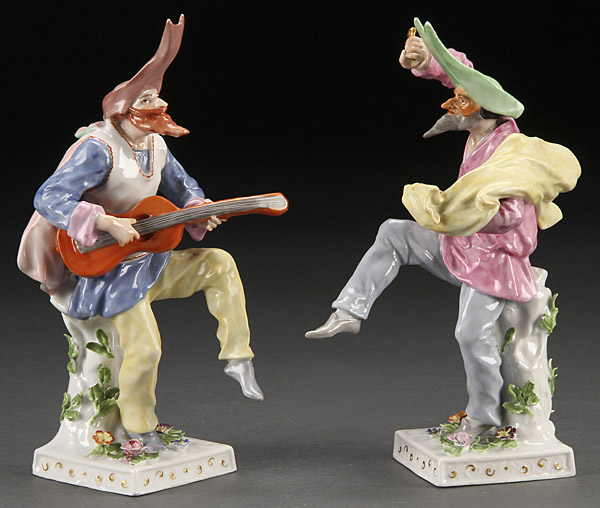 A PAIR OF DRESSEL AND KISTER GERMAN PORCELAIN FIGURES, LATE 19TH CENTURY. Of whimsical entertainers with applied florals, gilt spoked wheel marks. Height 7.25 inches (18.5 cm).