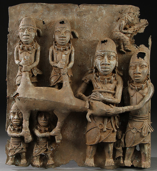A SCULPTED AFRICAN METAL PLAQUE. In the Benin-style. Height 20 inches (51 cm).