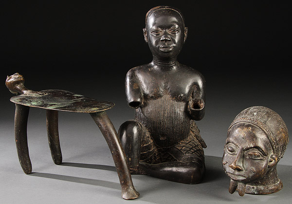A GROUP OF THREE METAL SCULPTED AFRICAN ITEMS. Including a Tadaife-style figure, a small bust and a small stool figure. Height 13.25 inches (33.5 cm).