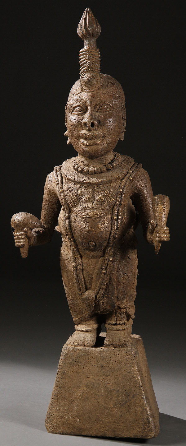 A LARGE BRONZED METAL AFRICAN FIGURE. Depicting a Benin-style chief figure. Height 43 inches (109 cm).