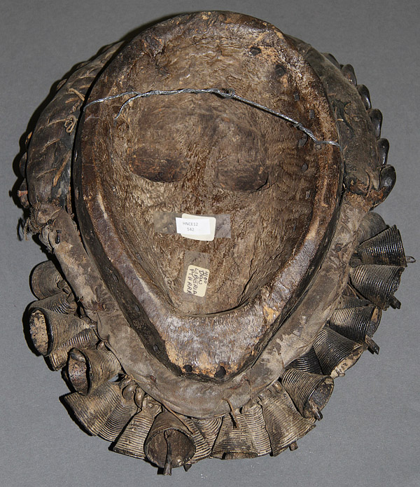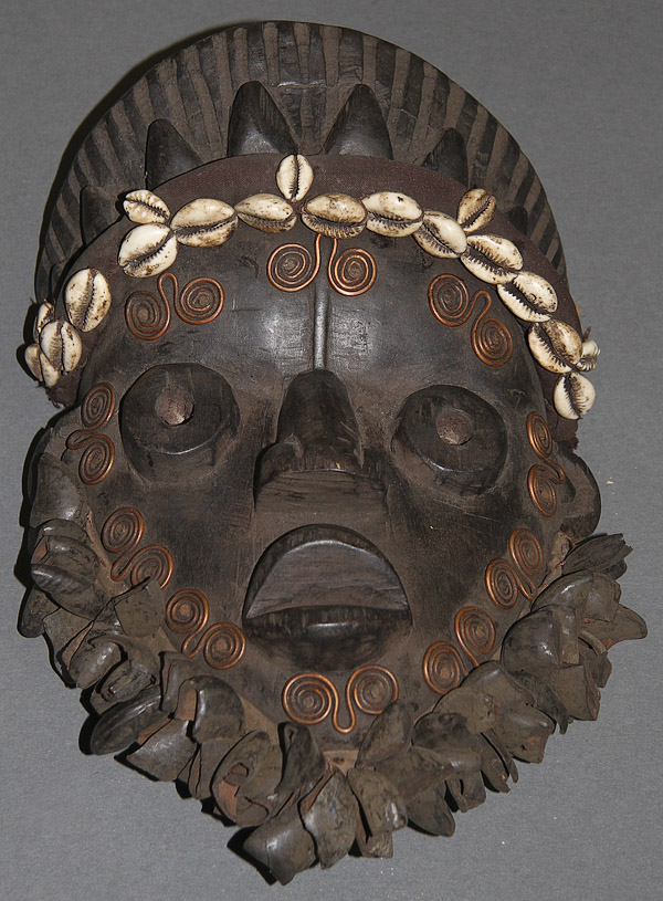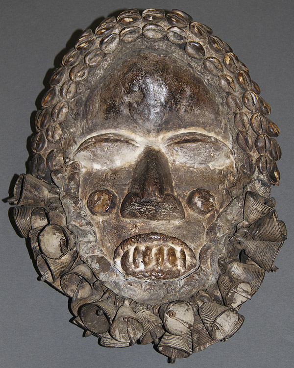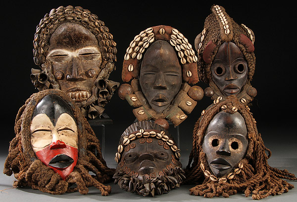 A GROUP OF SIX CARVED WOOD AFRICAN MASKS. All in the Dan-style, with shell, rope and bell embellishments. Greatest size 18.5 inches (47 cm).