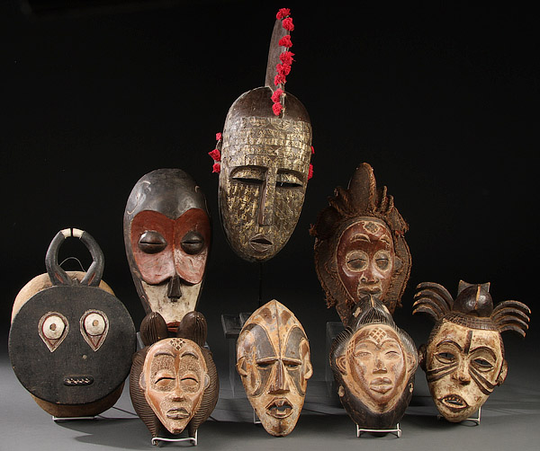 A GROUP OF EIGHT AFRICAN CARVED WOOD MASKS. Comprising Punu-style and Idoma-style masks, one with metal overlay. Greatest height 22 inches (56 cm).