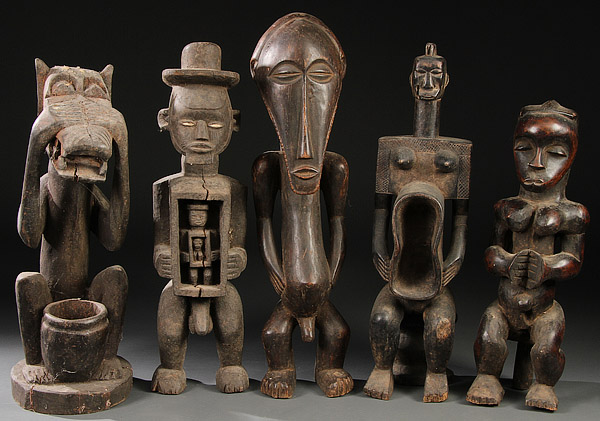 A GROUP OF FIVE AFRICAN CARVED WOOD FIGURES. Comprising Teke-style and Baule-style figures. Greatest height 27.5 inches (70 cm).