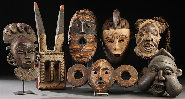 A GROUP OF SEVEN AFRICAN CARVED WOOD MASKS. Comprising Dogon-style, Baule-style, Gelede-style, Igbo-style, Bamu-style and Boa-style masks. Greatest height 26 inches (66 cm).