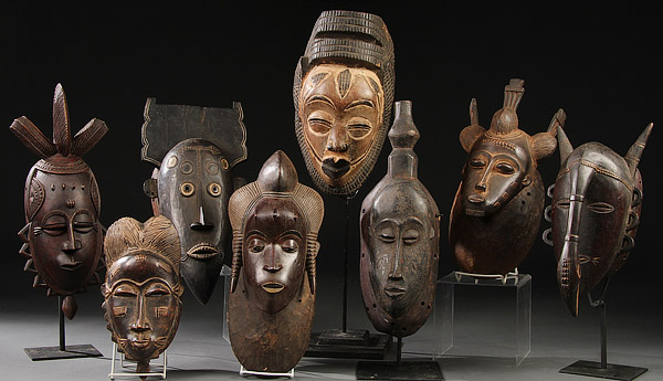 A GROUP OF EIGHT CARVED WOOD AFRICAN MASKS. Including Yaure-style, Guro-style, Bali-style, Gobo-style and Yaure-style masks. Greatest height 17.4 inches (43.9 cm).