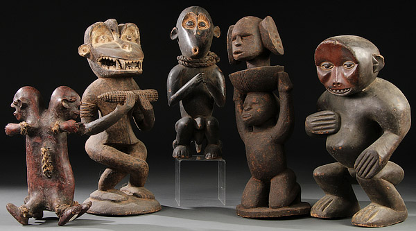 A GROUP OF FIVE CARVED WOOD AFRICAN FIGURES. Comprising a Pygmy-style conjoined male figure with rope, a Baule-style animal figure with cob of corn, a Baule style fertility figure, a Mabeto-style kneeling figure and a Fang-style monkey with remnants of polychrome. Tallest 19.75 inches (50.5 cm).