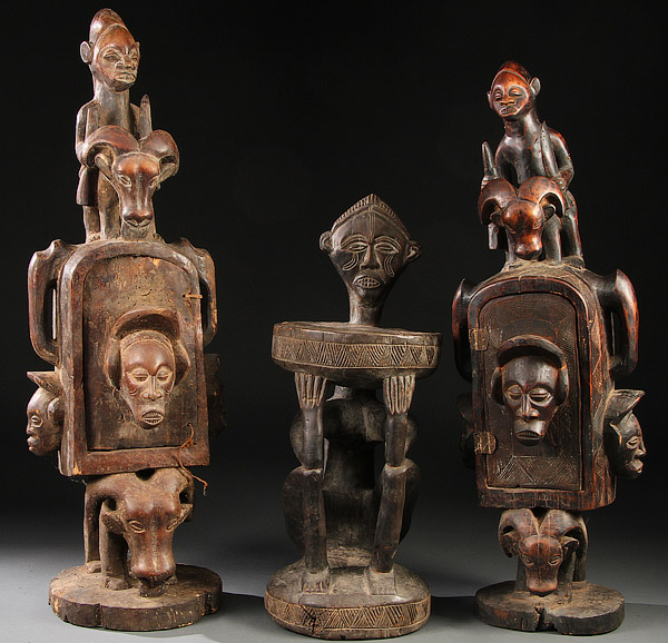 A GROUP OF THREE AFRICAN CARVED WOOD ITEMS. Including two Yaka-style reliquaries and a stool. Greatest height 41 inches (104 cm).