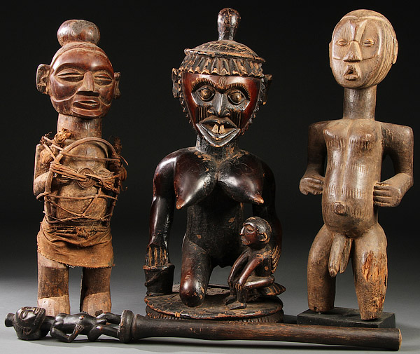 A GROUP OF FOUR AFRICAN CARVED WOOD ITEMS. Comprising Yaka-style, Mossi-style and Baule-style items. Greatest height 25 inches (63.5 cm).