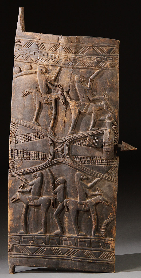 A LARGE AFRICAN TRIBAL CARVED WOOD GRAINERY DOOR PANEL WITH FOUR EQUESTRIAN FIGURES IN DEEP RELIEF. With four equestrian figures, 46 inches x 20 inches (117 x 51 cm).