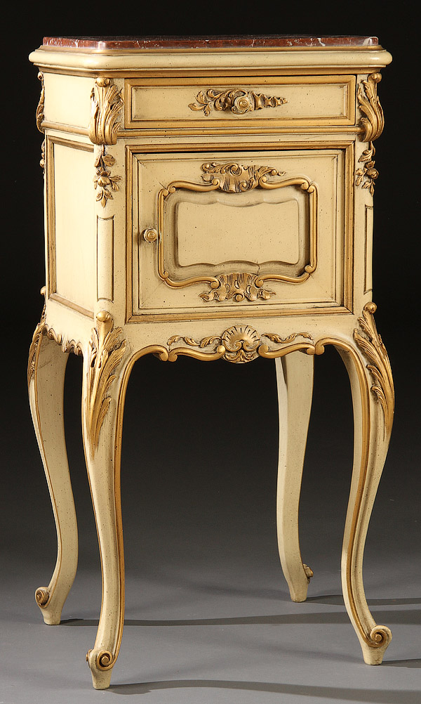 A FRENCH PROVINCIAL CREAM PAINTED GILT AND MARBLE TOPPED SIDE TABLE, CIRCA 1900. Walnut with antiqued ivory finish heightened in gilt below a rouge marble top. Height 35 inches, width 17.5 inches, depth 15.5 inches (88.9 x 44.4 x 39.4 cm).