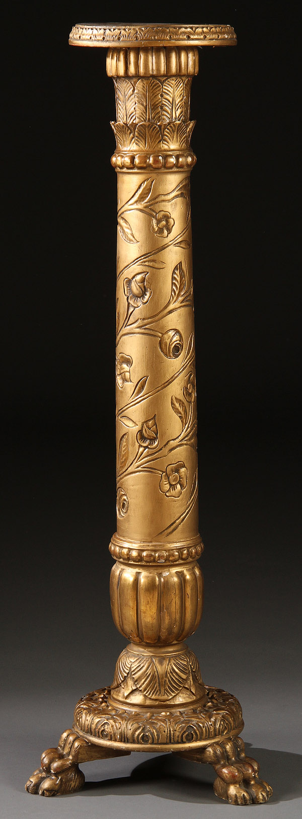 A VICTORIAN GILT PEDESTAL. Wood and molded gesso of cylindrical form with intaglio carved florals and acanthus raised on lions paw feet. Height 43 inches (109.2 cm), diameter 9.5 inches (24.1 cm).