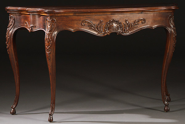 A FRENCH PROVINCIAL CARVED WALNUT AND BURRWOOD CONSOLE TABLE, LAST HALF 20TH CENTURY. With carved foliate scrolls on skirt and saber form legs. Height 27.5 inches, length 48 inches, depth 15 inches (69.8 x 121.9 x 38.1 cm).