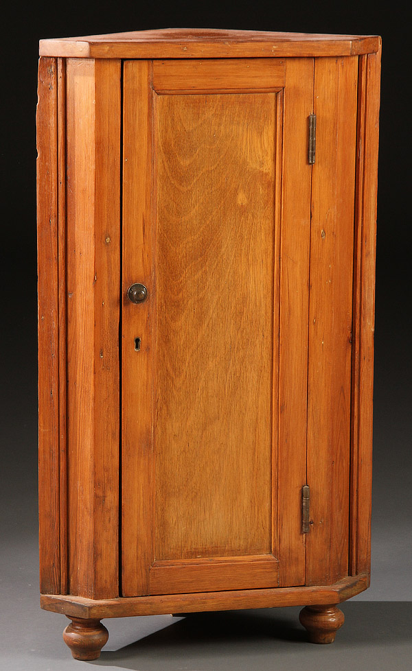 A CONTINENTAL PINE CORNER CABINET, FIRST HALF 19TH CENTURY. With paneled door raised on turned legs. Height 32.5 inches, width 18 inches, depth 11 inches (82.5 x 45.7 x 27.9 cm).