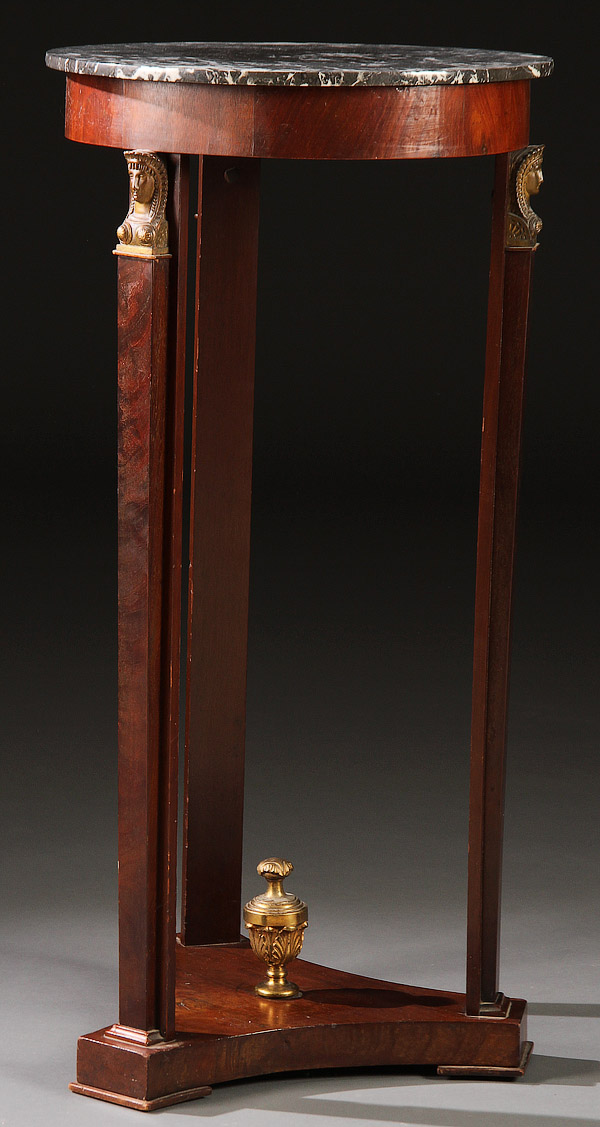 AN EMPIRE REVIVAL GILT BRONZE AND MARBLE MOUNTED GUERIDON. Raised on three legs terminating with Neoclassic bronze busts below a charcoal and white marble variegated top. Height 32.75 inches, diameter 16 inches (83.2 x 40.6 cm)