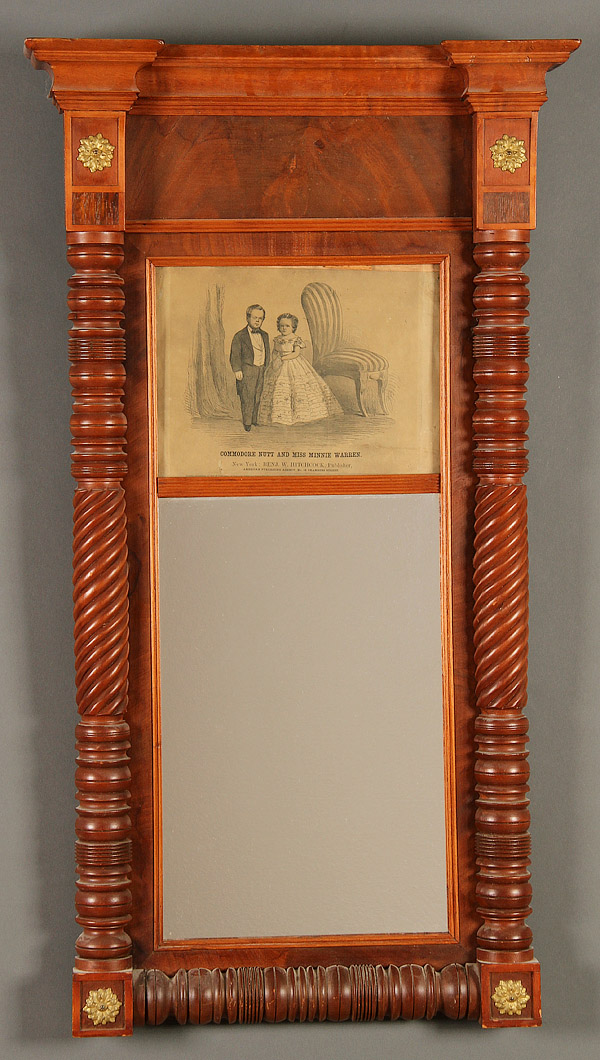 AN EARLY AMERICAN WALNUT AND MAHOGANY LOOKING GLASS, MID 19TH CENTURY. Below a Hitchcock print of Commodore Nutt and Miss Minnie Warren with turned columns, 39 inches x 22 inches (99 x 55.9 cm).