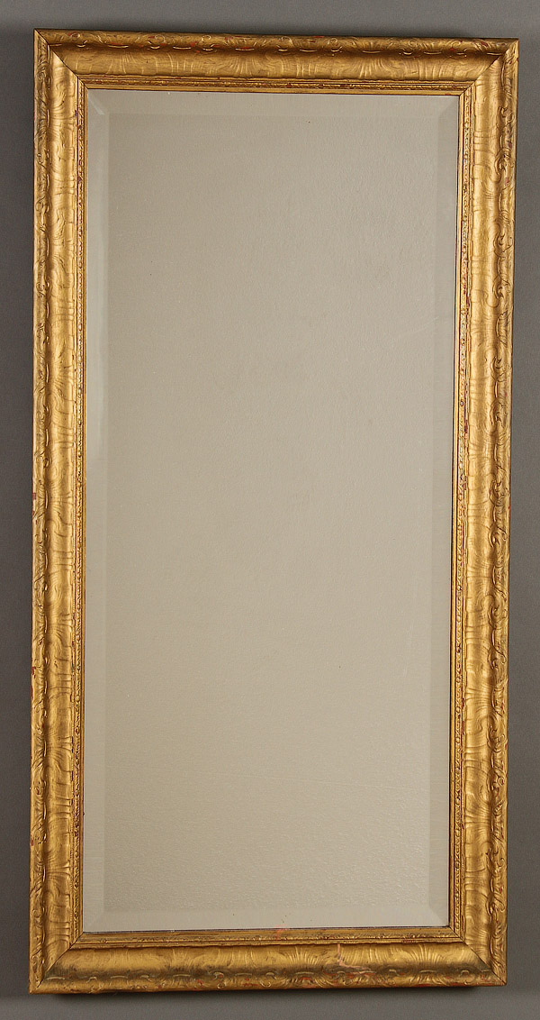 A GILT WOOD AND BEVELED GLASS DRESSING MIRROR, CIRCA 1900. 45 inches x 23 inches (114.3 x 58.4 cm).