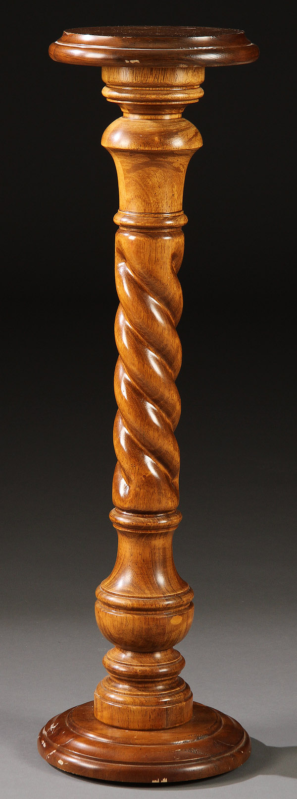 A BUTLER FURNITURE TURNED WALNUT PEDESTAL, 20TH CENTURY. Height 34 inches, diameter 9.5 inches (24.1 cm).