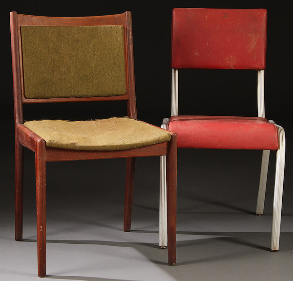 A CARLSSON VETLANDA SWEDISH TEAK WOOD SIDE CHAIR, MID 20TH CENTURY. Together with an early Wear-ever aluminum industrial arts side chair.