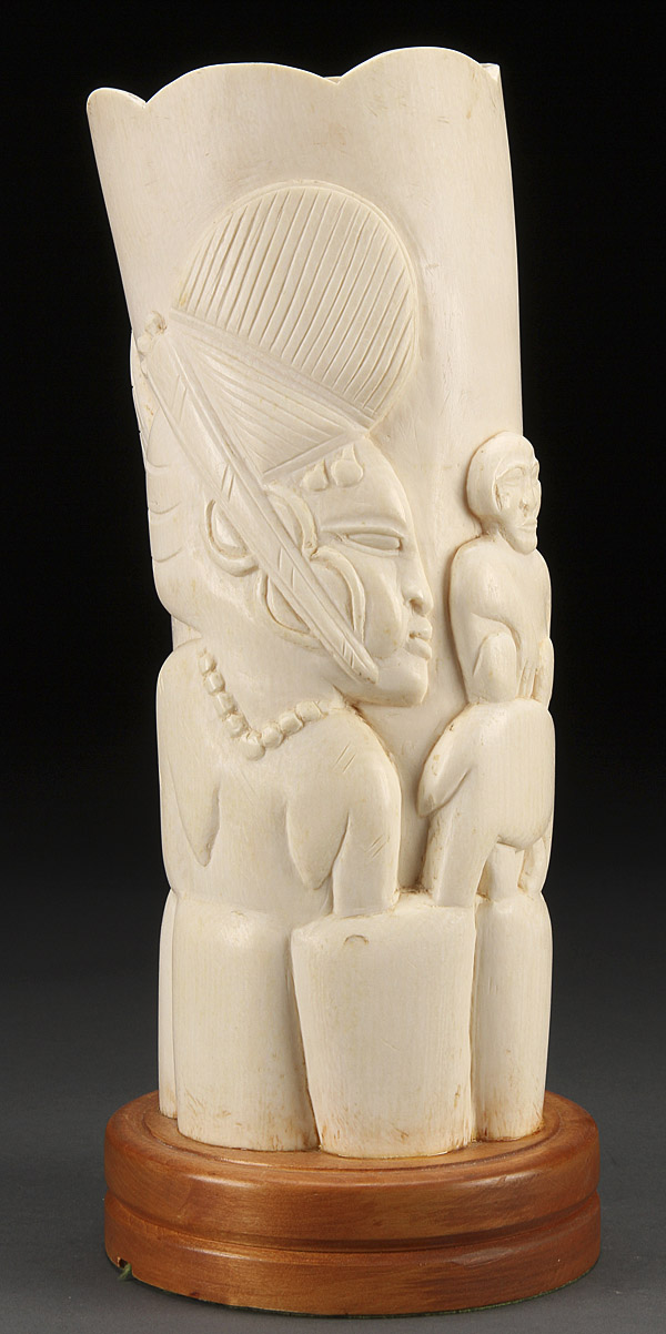 AN AFRICAN CARVED IVORY TUSK, 20TH CENTURY. Carved in deep relief with natives depicted in a village setting. Height 13 inches (33 cm).
