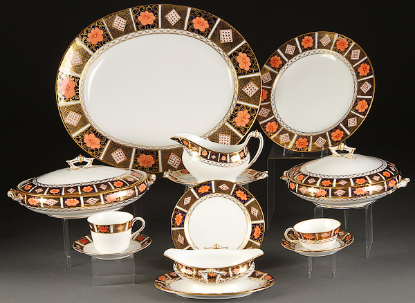A ROYAL CROWN DERBY "IMARI" PARTIAL DINNERWARE SET, 20TH CENTURY. Comprising twelve 10.5 inch (26.5 cm) plates, six saucers, six teacups and one each; sauce dish, coffee cup and saucer, salad plate, gravy and underplate, covered round server, covered oval server and 17 inch (43 cm) platter. 33 pieces total.