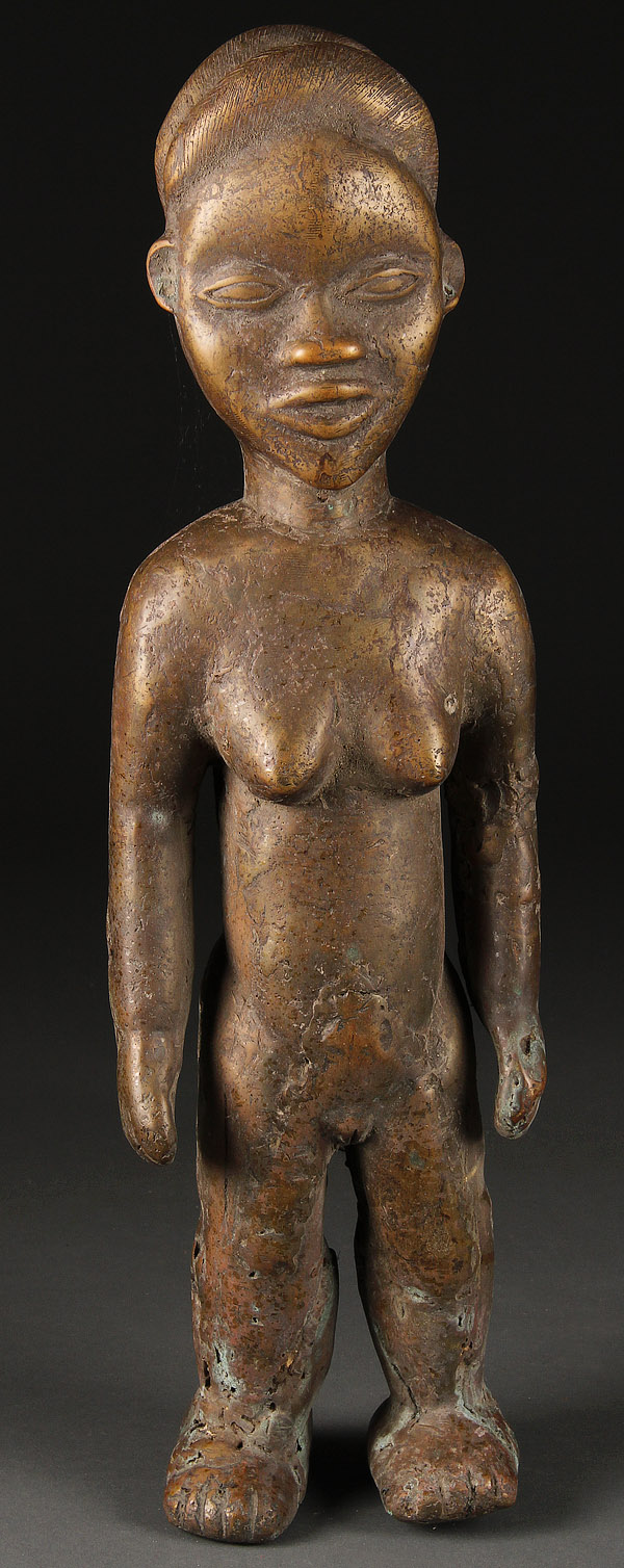 AN AFRICAN TRIBAL ART BRONZE FIGURE. Of a woman depicted in standing form with three lobes coiffure. Height 21 inches (53.5 cm).