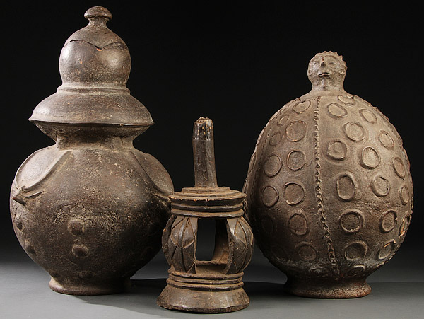 A GROUP OF THREE LARGE AFRICAN CARVED WOOD VESSELS. Comprising a pair of Lobi-style and Mossi-style vessels and a carved wood figure. Greatest height 25 inches (63.5 cm).