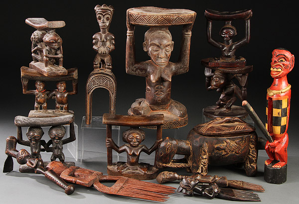 A GROUP OF FOURTEEN CARVED WOOD AFRICAN FIGURES. Comprising a Luba stool, Dogon tobacco box, polychromed fertility figure, combs and other decorative sculptures. The tallest 16.1 inches (41 cm).