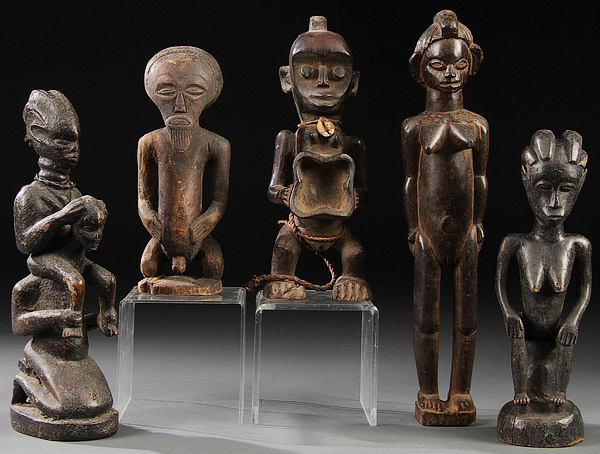 A GROUP OF FIVE CARVED WOOD AFRICAN FIGURES. Comprising Bali-style, Chokwe-style, Luba-style, Soncye-style and Mende-style figures. Greatest height 16.4 inches (41.8 cm).
