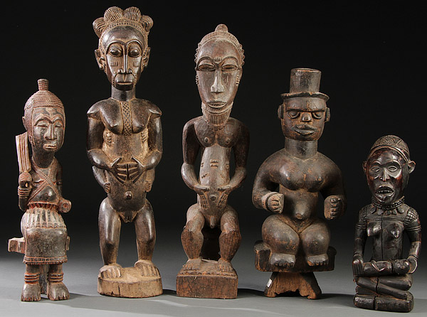 A GROUP OF FIVE CARVED WOOD AFRICAN FIGURES. In the Baule, Ibo and Kuba styles, ranging in height from 14 inches to 23.5 inches.