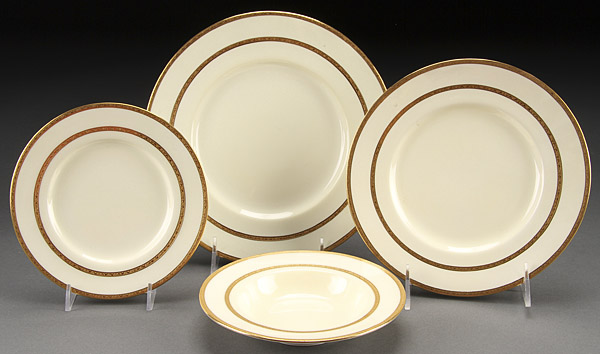 MINTON GOLD RIMMED PORCELAIN DINNERWARE, EARLY 20TH CENTURY. Comprising 12 pieces for Tiffany & Co. with monogrammed rims and 23 pieces for Dohrmann Co. with gold rims on ivory ground. All plates of various size up to 10.5 inches (26.5 cm) diameter.