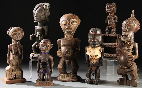 A GROUP OF SEVEN CARVED WOOD AFRICAN FIGURES. Comprising a maternity figure, Chokwe-style male standing figure, a Bacongo-style figure with blue beaded necklace, a Songye-style male standing figure, a Bacongo-style male figure with remnants of a hide-tunic, a Fang-style shelf with standing male figure and a Songye-style male figure with beading and acorn decoration. Tallest 17.5 inches (44.2 cm).
