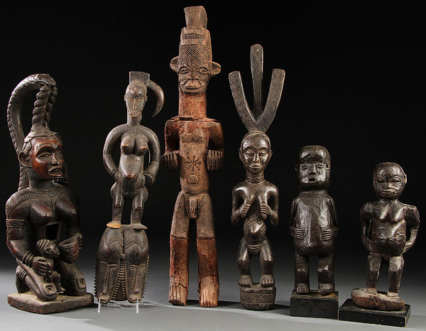 A GROUP OF SIX CARVED WOOD AFRICAN FIGURES. Including a Bacongo-style reliquary figure, a Senufo-style fertility figure, Ibo-style standing figure, a Baluba-style figure and a pair of Makonde-style figures. Tallest 30.6 inches (77.4 cm).