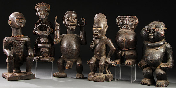 A GROUP OF SIX CARVED WOOD AFRICAN FIGURES. Comprising a Pongo-style ancestral figure, Bamon-style seated figure with rope clothing, Bamu-style fertility figure, a Yombe-style seated figure with polychromed eyes, seated fertility figure with rope belt and a Mupu-Tikare-style squatting figure. Tallest 20.75 inches (52.9 cm).