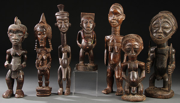 A GROUP OF SEVEN CARVED WOOD AFRICAN FIGURES. Including Kuba-style, Bena Lulua-style, Lora-style, Dan-style, and Hemba-style fertility figures. Tallest 18 (47.1 cm).