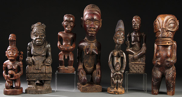 A GROUP OF SIX CARVED WOOD AFRICAN FIGURES. Comprising Bacongo, Yoruba, Kuba, Luba and Yombe-styles. Some maternity figures. Together with a Tahitian carved wood figure. Greatest height 23.5 inches (59 cm).