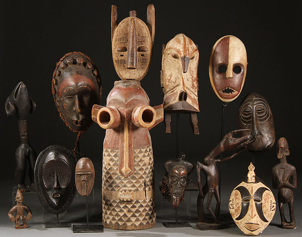 A MIXED LOT OF FOURTEEN CARVED AFRICAN ITEMS, INCLUDING MASKS AND FIGURES. Comprising Igbo, Hemba, Lengola, Babanki, Bambara, Toma, Dan, Chokwe, Yoruba and Lulua style masks and figures. Greatest height 29.25 inches (74 cm).