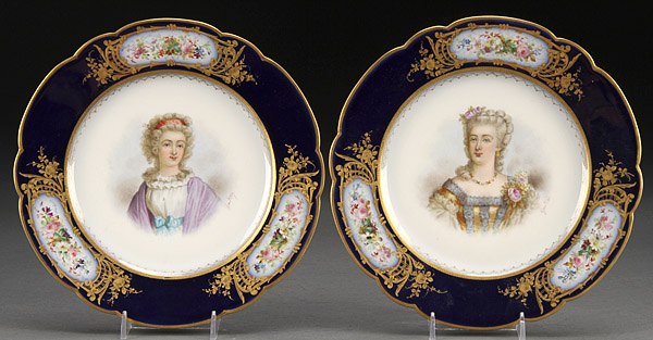 TWO FRENCH PORCELAIN HAND PAINTED SEVRES STYLE PORTRAIT CABINET PLATES, CIRCA 1900. Depicting Mademoiselle de Somebereuil and Contessa Dubarry, each with spurious Sevres marks and artist signed "Gaultier." Diameter 8.75 inches (22 cm).