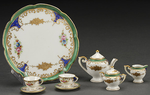 A VERY FINE OCCUPIED JAPAN MINIATURE OR DOLL SIZED TEA SET. Finely decorated porcelain comprising a teapot, cream, sugar and two cups and saucers. Marked Occupied Japan. Diameter 3.675 inches (9 cm).