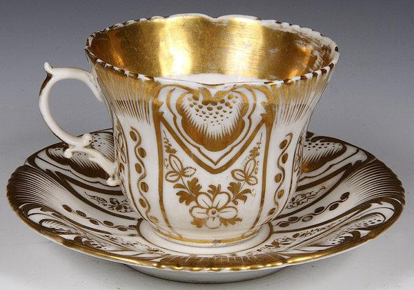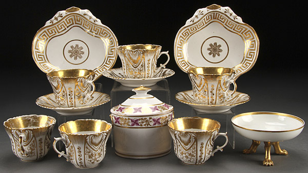 A DRESDEN AND OLD PARIS PORCELAIN GROUP, 19TH CENTURY. Comprising six gold decorated coffee cups with three matching saucers, two matching gilt decorated fruit dishes, together with a Meissen dish and Staffordshire covered sugar (both damaged).
