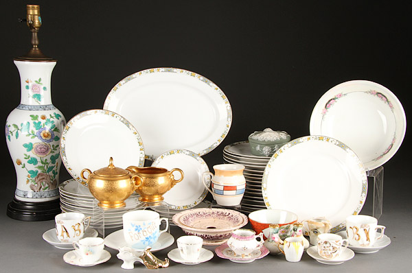 A 59 PIECE VINTAGE PORCELAIN GROUP, 20TH CENTURY. Comprising 33 piece Noritake "The Monterey" dinnerware, green Jasperware heart shape box, etched gold cream and sugar, German Art Deco mold three handle toothpick, remembrance cups, salt and pepper shakers, and a contemporary Famille Rose table lamp.