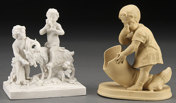 A PAIR OF 19TH CENTURY BISQUE FIGURAL GROUPS. Comprising a pair of putti with a goat and young girl with boot form match holder. Height 6.25 inches (16 cm).