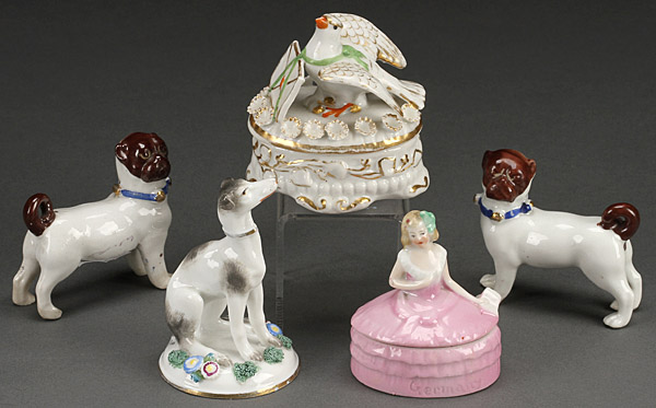 A VICTORIAN STAFFORDSHIRE PORCELAIN GROUP, 19TH CENTURY. Comprising a covered stamp box with dove, a pair of pug dogs and a seated hound, together with a German figural covered box. The largest 3 inches (7.5 cm).