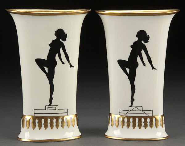 A PAIR OF GERMAN ART DECO PORCELAIN VASES, EARLY 20TH CENTURY. Each of flattened oval form with black enameled nude silhouettes above a gilt acanthus pendants base, "Made in Germany" circle mark. Height 8.75 inches (22.3 cm).