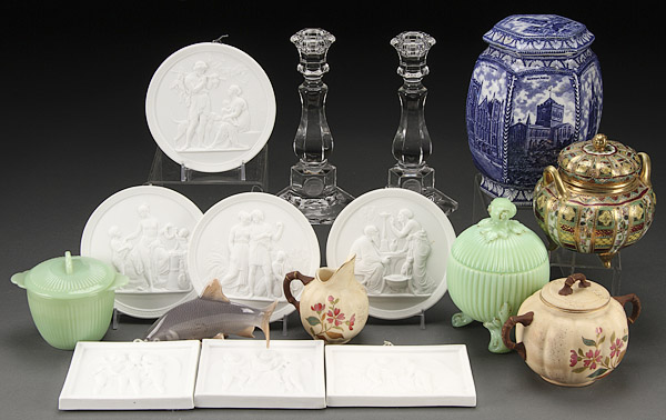 A VINTAGE PORCELAIN AND GLASS DECORATIVE GROUP, 20TH CENTURY. Comprising seven Royal Copenhagen bisque classical plaques, a Royal Copenhagen figure of a salmon, a Ringtons blue transfer tea castor, a Nippon sugar bowl, coin pattern crystal candlesticks and other items. The largest 7.5 inches (19 cm).