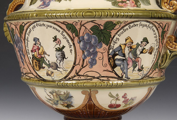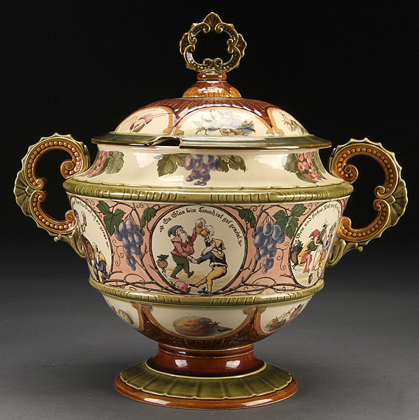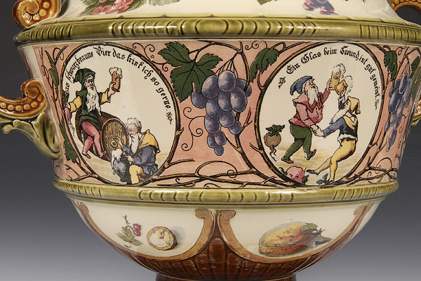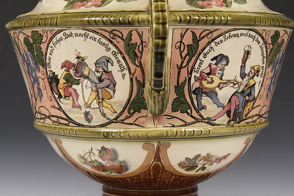 A GERMAN METTLACH POTTERY COVERED PUNCH BOWL, CIRCA 1900. Decorated with scenes of drinking gnomes, incised marks and pattern #2339. Height 15 inches (38 cm).