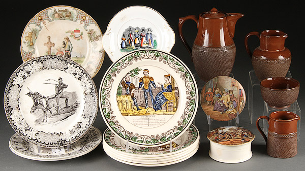 AN ENGLISH AND FRENCH 19TH CENTURY CERAMICS GROUP. 17 pieces comprising a Langelyware coffee pot, two jugs and a sugar bowl, a Prattware village wedding scene covered box, a Prattware hide and seek scene lid, Welsh costumes tray, six French soft paste seriesware plates marked "L.L. & T", three French creil transferware plates with military scenes and a sarreguemines scenic plate. The largest 8.5 inches (21.5 cm) diameter.